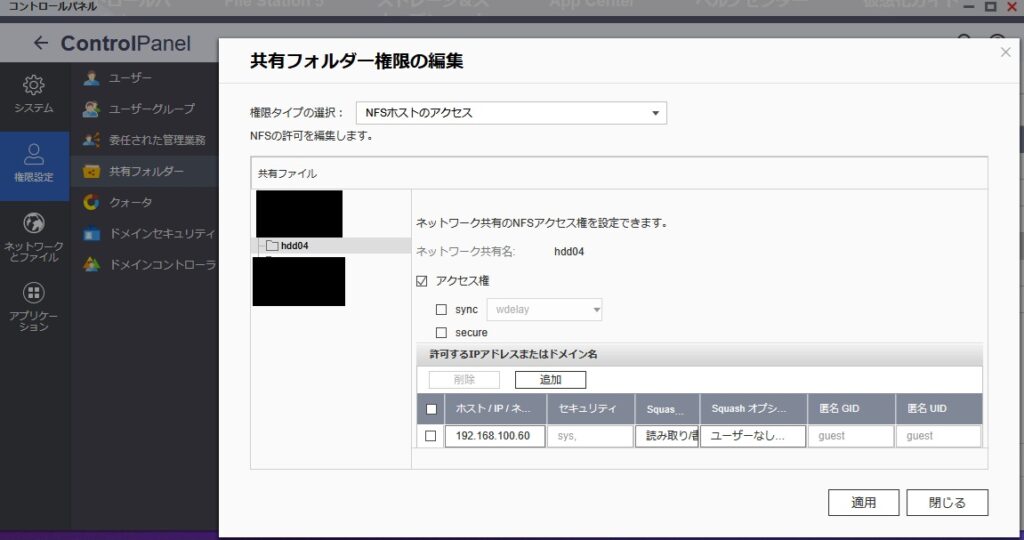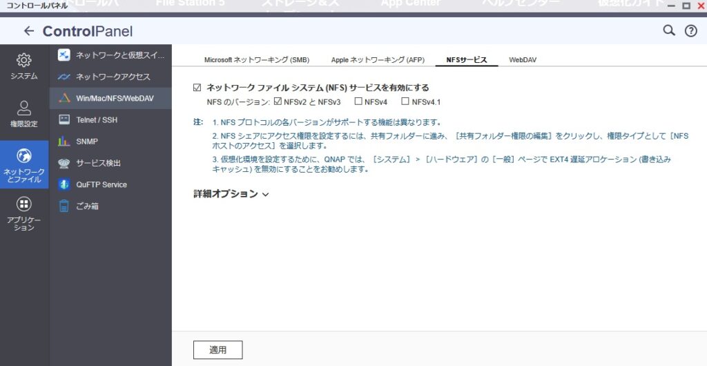 QNAP NASの設定:NFS有効化